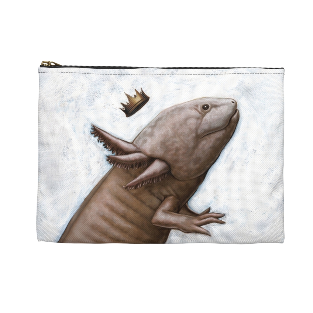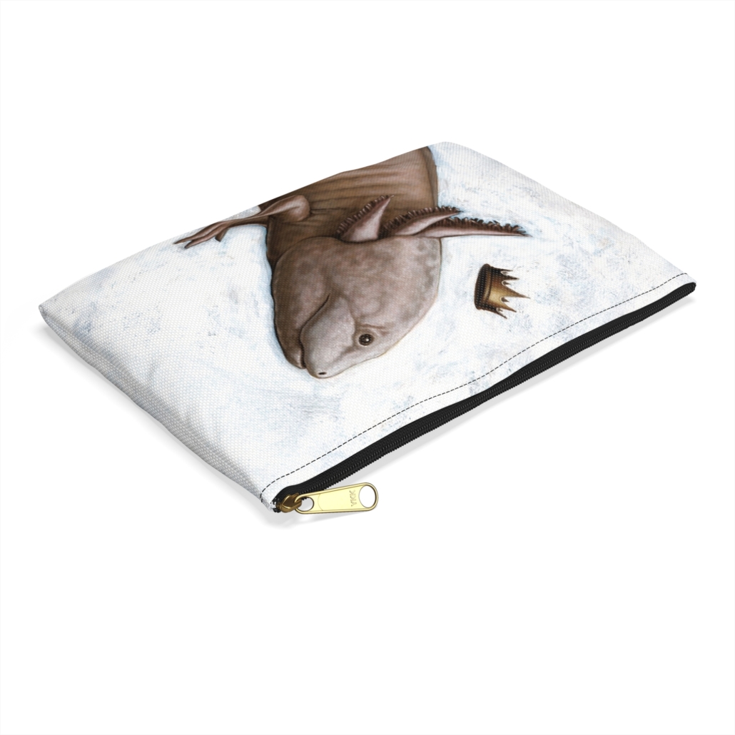 This KING AXOLOTL illustrated accessory pouch by artist Carolina Lebar features vibrant colors and a durable zipper closure. Perfect for adults looking for a unique and functional addition to their everyday accessories.